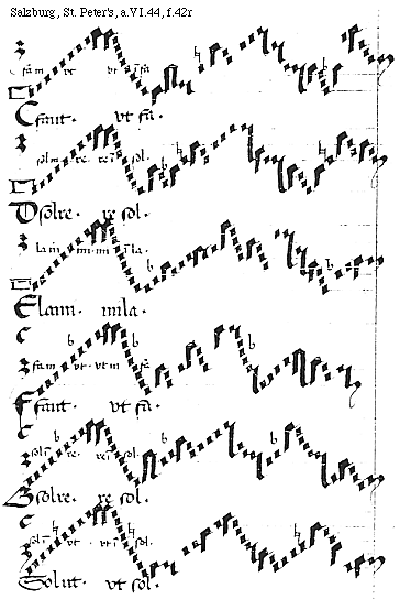 [f.42r] [Salzburg, St. Peter's, a.VI.44, f.42r; text: fa in vt, vt in fa, Cfaut. vtfa. sol in re. re in sol. Dsolre. resol. la in mi. mi in la. Elami. mila. Ffaut. Gsolre. sol in vt. vt in sol. Solut. vtsol.] [ANOPRNO 02GF]