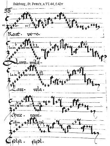 [f.42v] [Salzburg, St. Peter's, a.VI.44, f.42v; text: re in vt. vt in re, Reut. vtre. la in mi. mi in la. Alami. mila. la in re. re in la. Lare. rela. mi in re. re in mi. Mire. remi. sol in fa, fa in sol, Csolfa. fasol.] [ANOPRNO 03GF]