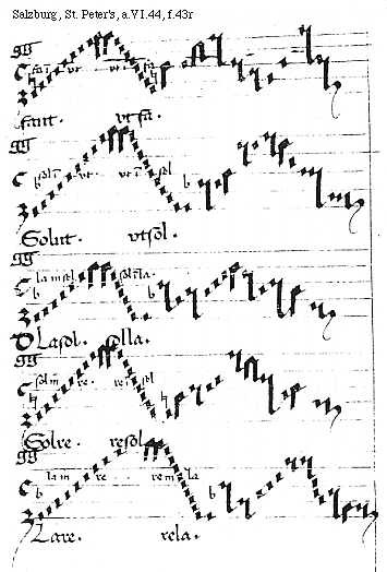 [f.43r] [Salzburg, St. Peter's, a.VI.44, f.43r; text: fa in vt, vt in fa, faut. vt fa. sol in vt. vt in sol. Solut. vtsol. la in sol. sol in la. Dlasol. solla. sol in re. re in sol, Solre. resol. la in re. re in la. Lare. rela.] [ANOPRNO 04GF]