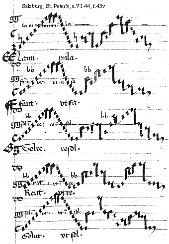 [f.43v] [Salzburg, St. Peter's, a.VI.44, f.43v; text: la in mi. mi in la. EELami. mila. fa in vt. vt in fa, FFfaut. vtfa. sol in re. re in sol. GGSolre. resol. re in vt. vt in re, Reut. vtre. sol in vt. vt in sol. Solut. vtsol.] [ANOPRNO 05GF]