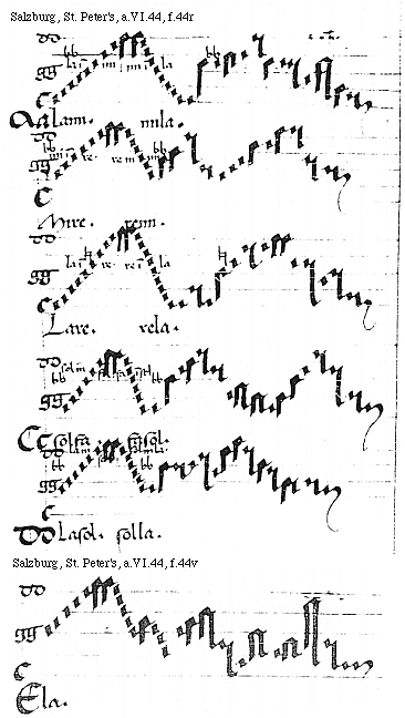 [f.44r] [Salzburg, St. Peter's, a.VI.44, f.44r; text: la in mi. mi in la. AAlami. mila. mi in re. re in mi. Mire. remi. la in re. re in la. Lare. rela. sol in fa. fa in sol, CCsolfa. fasol. la in sol. sol in la. DDLasol. solla.] [ANOPRNO 06GF]