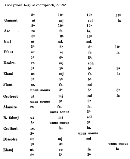 Nota quod unisonus de omne fa. similis est fa. tercia est la. vel re. quinta est fa. vel ut. sexta est sol. vel re. Octava est fa. Decima est la. vel. re. Duodecima est fa. vel. ut. terciadecima est sol. vel. re. et quintadecima est fa.
