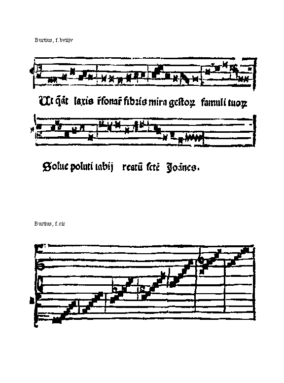 [Burtius, f.bviijv; text: Ut queant laxis resonare fibris mira gestorum famuli tuorum Solue poluti labij reatum sancte Ioannes.] [BURMUS1 02GF]