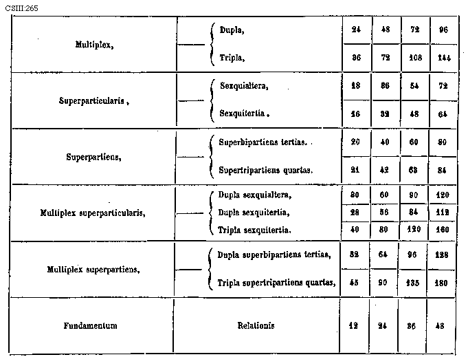 [CSIII:265, text: Multiplex, Dupla, Tripla, Superparticularis, Sexquialtera, Sexquitertia, Superpartiens, Superbipartiens tertias, Supertripartiens quartas, Multiplex superparticularis, Dupla sexquialtera, Dupla sexquitertia, Tripla sexquitertia, Multiplex superpartiens, Dupla superbipartiens tertias, Tripla supertripartiens quartas, Fundamentum, Relationis, 24, 48, 72, 96, 36, 108, 144, 18, 54, 16, 32, 64, 20, 40, 60, 80, 21, 42, 63, 84, 30, 60, 90, 120, 28, 56, 84, 112, 160, 64, 96, 128, 45, 90, 135, 180, 12, 48.] [FLATRA 01GF]