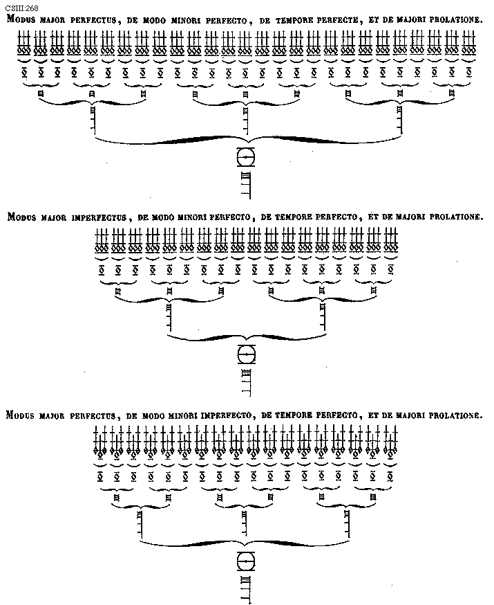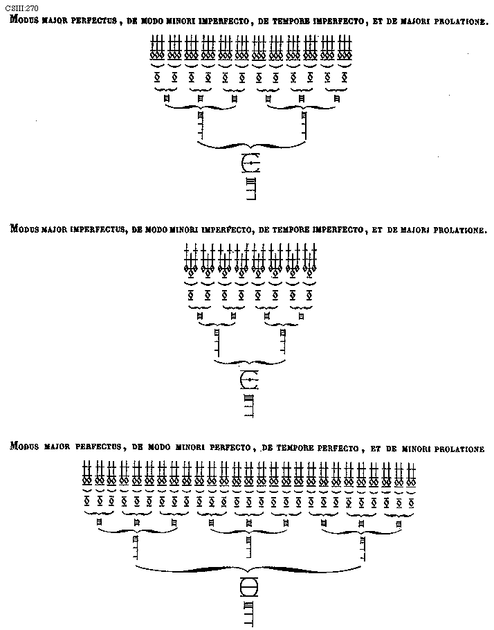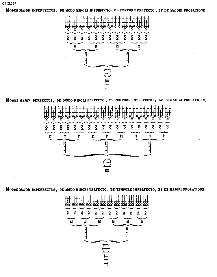 [269] [CSIII:269; text: Modus major imperfectus, de modo minori imperfecto, de tempore perfecto, et de majori prolatione. Modus major perfectus, de modo minori perfecto, de tempore imperfecto, et de majori prolatione. Modus major imperfectus, de modo minori perfecto, de tempore imperfecto, et de majori prolatione.] [FLATRA 03GF]