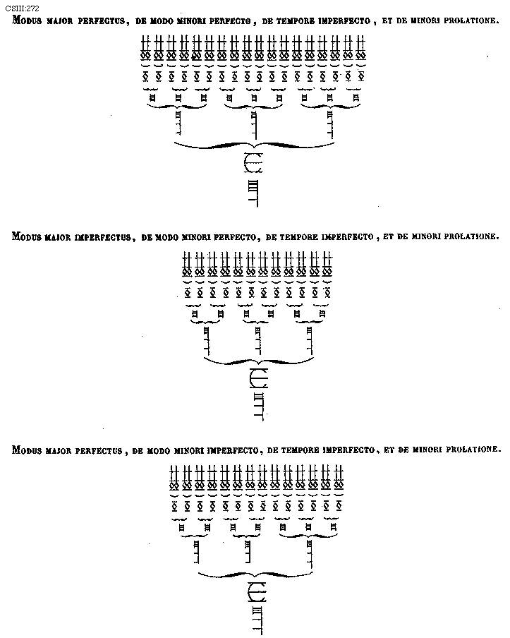 [272] [CSIII:272; Modus major perfectus, de modo minori perfecto, de tempore imperfecto, et de minori prolatione. Modus major imperfectus, de modo minori perfecto, de tempore imperfecto, et de minori prolatione. Modus major perfectus, de modo minori imperfecto, de tempore imperfecto, et de minori prolatione.] [FLATRA 06GF]