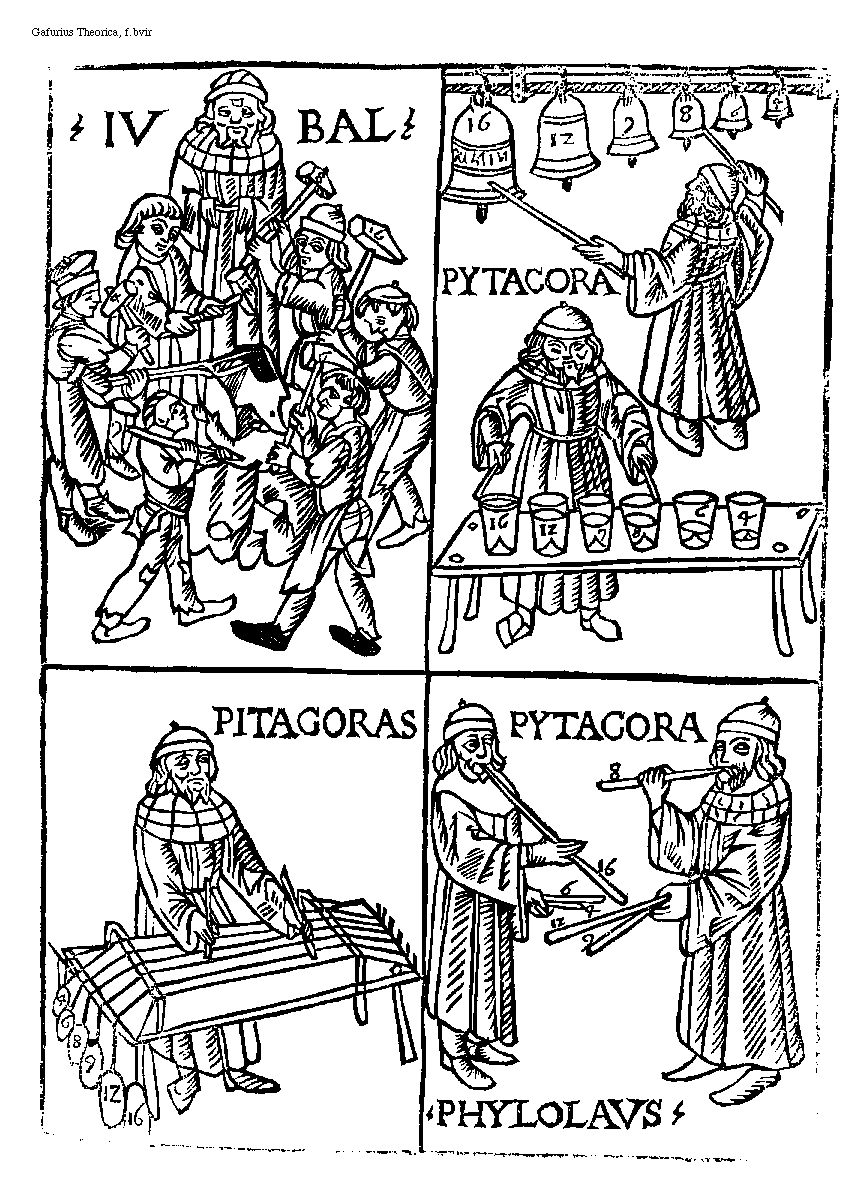 [f.bvir] [Gafurius, Theorica, f.bvir; text: Ivbal, Pytagora, Pitagoras, Phylolavs, 4, 6, 8, 9, 12, 16] [GAFTM1 02GF]