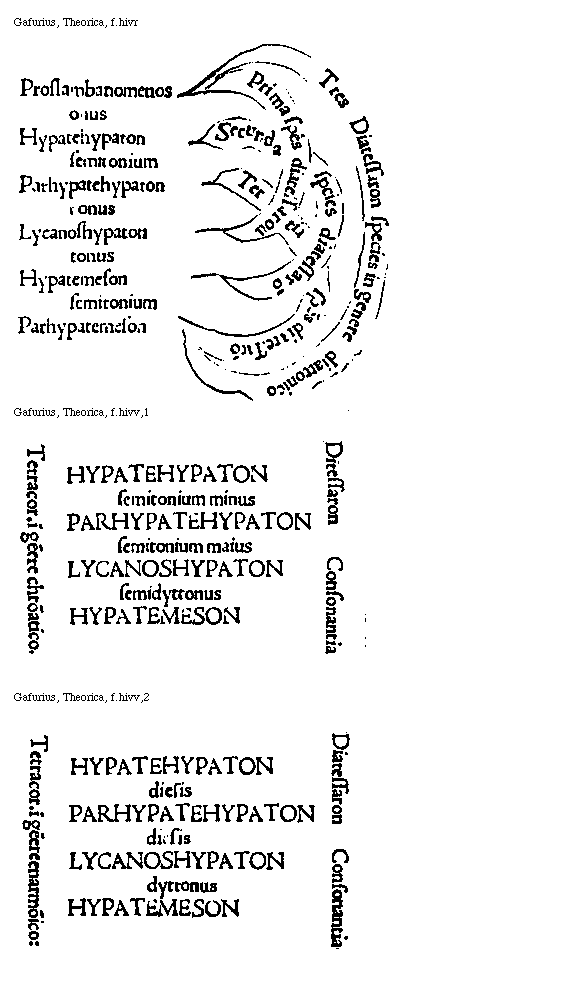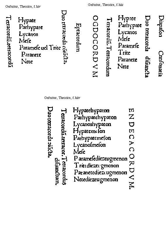 [Gafurius, Theorica, f.hiv; text: Hypate, Parhypate, Lycanos, Mese, Paramese uel Trite, Paranete, Nete, Eptacordum, Duo tetracorda coniuncta. Tetracordum.] [GAFTM5 01GF]