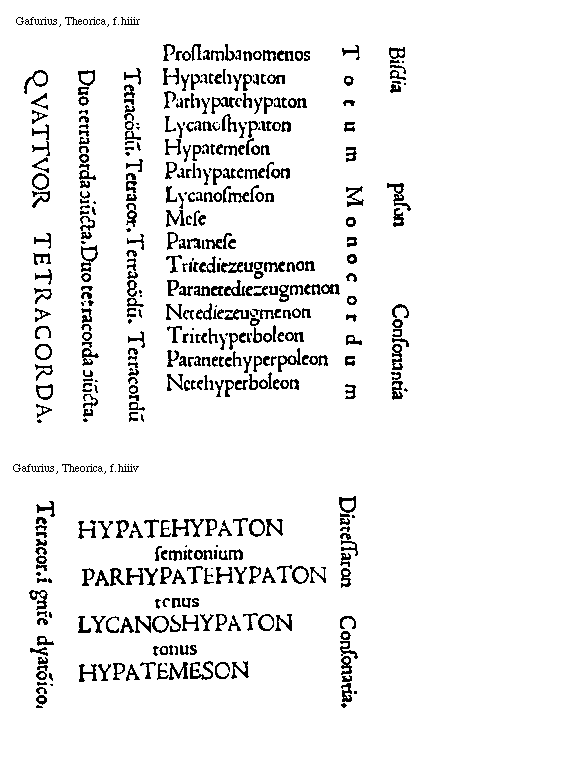 [f.hiiiv] [Gafurius, Theorica, f.hiiiv; text: HYPATEHYPATON, PARHYPATEHYPATON, LYCANOSHYPATON, HYPATEMESON, semitonium, tonus, Diatessaron Consonantia. Tetracordum in genere dyatonico.] [GAFTM5 02GF]