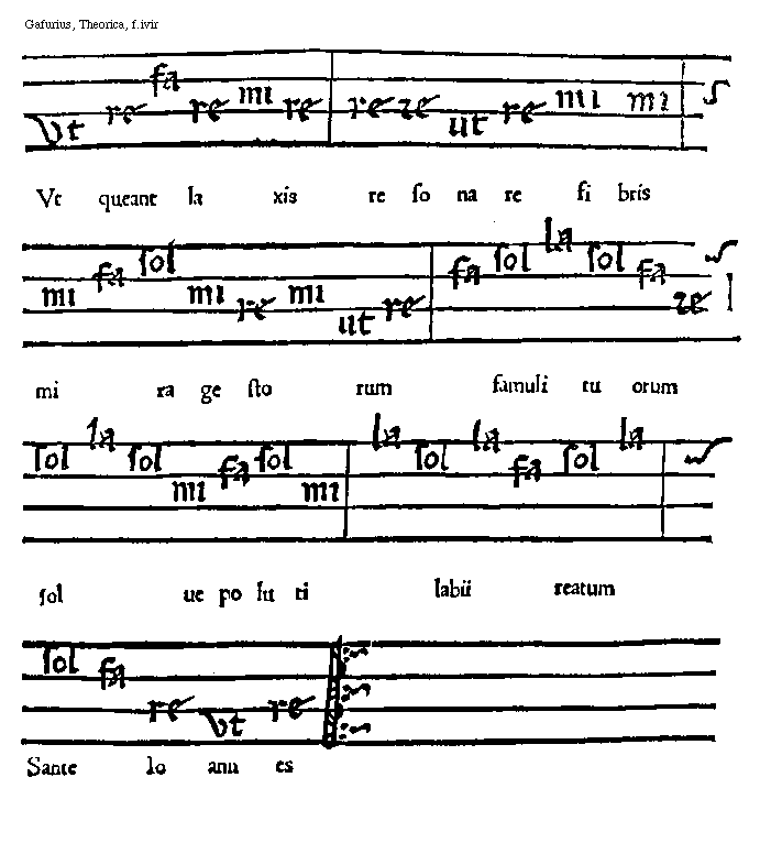 [Gafurius, Theorica, f.ivir; text: ut, re, mi, fa, sol, la, Vt queant laxis resonare fibris mira gestorum famuli tuorum solue poluti labii reatum Sante Ioannes] [GAFTM5 08GF]