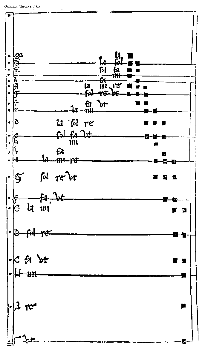 [f.kiv] [Gafurius, Theorica, f.kiv; text: [Gamma] vt, A re, [sqb] mi, C fa vt, D sol re, E la mi, F fa vt, G sol re vt, a la mi re, b fa, [sqb] mi, c sol fa vt, d la sol re, e la mi, f fa vt, g sol re vt, aa la mi re, bb fa, [sqb][sqb] mi, cc sol fa, dd la sol, ee la] [GAFTM5 09GF]