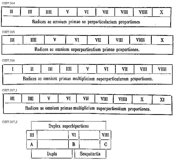 [CSIV:316; text: I II III IIII V VI VII VIII VIIII, Radices ac omnium primae multiplicium superparticularum proportiones.] [GALRIT2 01GF]
