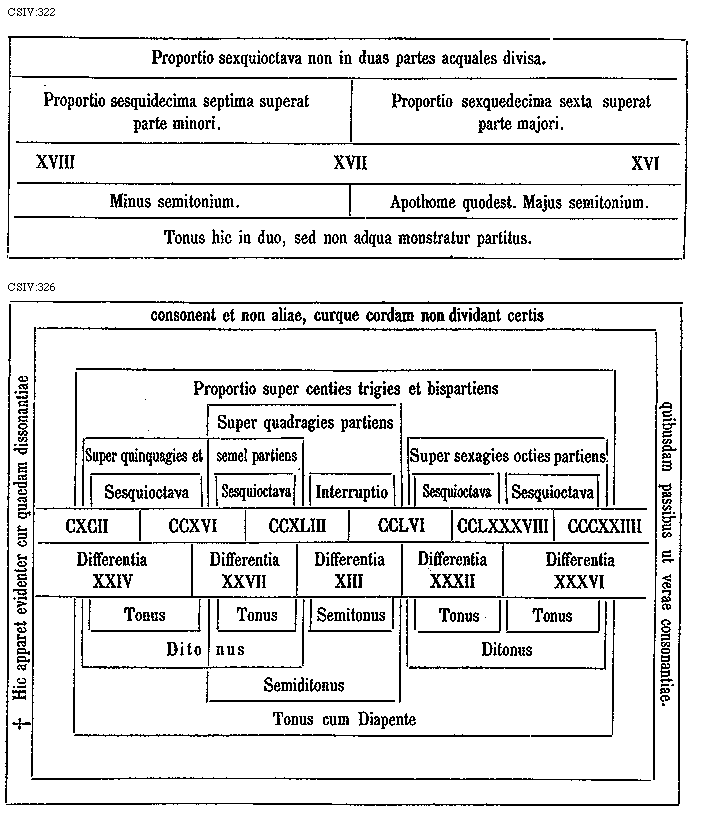 [CSIV:322; text: Proportio sexquioctava non in duas partes acquales divisa. Proportio sesquidecima septima superat parte minori. Proportio sexquedecima sexta superat parte majori. XVIII XVII XVI, Minus semitonium. Apothome quodest. Majus semitonium. Tonus hic in duo, sed non adqua monstratur partitus.] [GALRIT2 02GF]