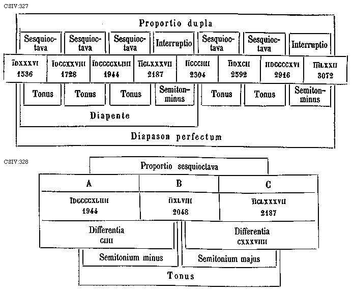 [CSIV:327; text: Proportio dupla, Sesquioctava, Interruptio, IDXXXVI 1536, IDCCXXVIII 1728, IDCCCCXLIIII 1944, IICLXXXVII 2187, IICCCIIII 2304, IIDXCII 2592, IIDCCCCXVI 2916, IIILXXII 3072, Tonus, Semiton-minus, Diapente, Diapason perfectum] [GALRIT2 03GF]