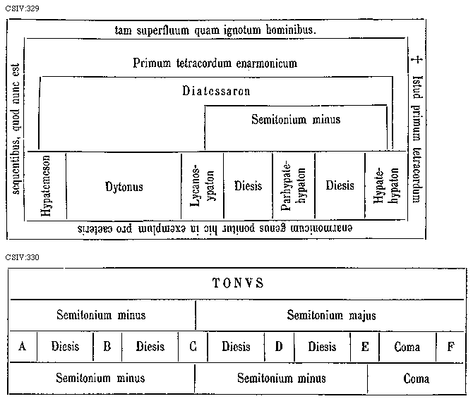 [CSIV:329; text: * Istud primum tetracordum enarmonicum genus ponitur hic in exemplum pro caeteris sequentibus, quod nunc est tam superfluum quam ignotum hominibus. Primum tetracordum enarmonicum, Diatessaron, Semitonium minus, Hypatemeson, Dytonus, Lycanosypaton, Diesis, Parhypatehypaton, Diesis, Hypatehypaton] [GALRIT3 01GF]