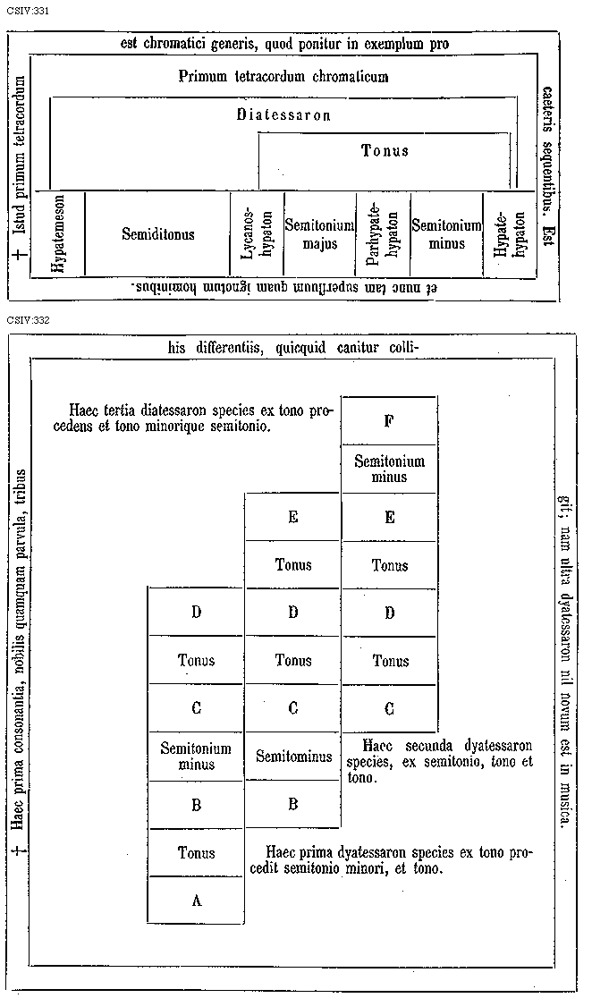 [331] [CSIV:331; text: * Istud primum tetracordum est chromatici generis, quod ponitur in exemplum pro caeteris sequentibus. Est et nunc tam superfluum quam ignotum hominibus. Primum tetracordum chromaticum, Diatessaron, Tonus, Hypatemeson, Semiditonus, Lycanoshypaton, Semitonium majus, Parhypatehypaton, Hypatehypaton] [GALRIT3 02GF]