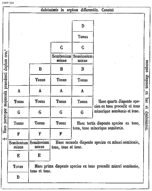 [334] [CSIV:334; text: * Haec parumper majuscula praecdenti duplam creat dulcissimis in septem differentiis. Constat namque diapason ex hac et dyatessaron. D, Tonus, C, Semitonium minus, B, A, G, Haec quarta diapente species ex tono procedit et tono minorique semitonio et tono. F, Haec tertia diapente species ex tono, tono, tono minorique semitonio. E, Haec secunda diapente species ex minori semitonio, tono, tono et tono. D, Haec prima diapente species ex tono procedit minori semitonio, tono et tono.] [GALRIT3 03GF]