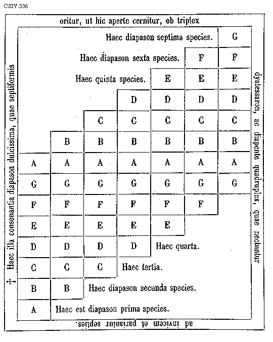 [CSIV:336; text: * Haec illa consonantia diapason dulcissima, quae septiformis oritur, ut hic aperte cernitur, ob triplex dyatessaron, ac diapente quadruplex, quae nectuntur ad invicem et pariantur septies. Haec diapason septima species. Haec diapason sexta species. Haec quinta species. A B C D E F G, Haec quarta. Haec tertia. Haec diapason secunda species. Haec est diapason prima species.] [GALRIT3 04GF]