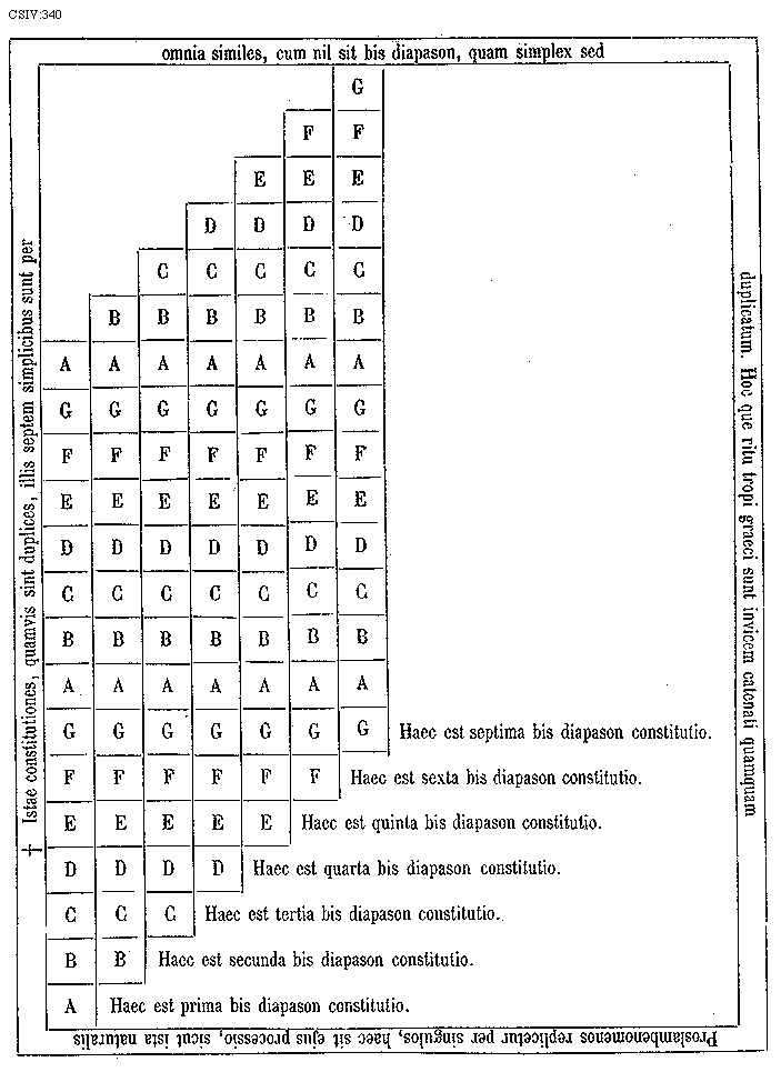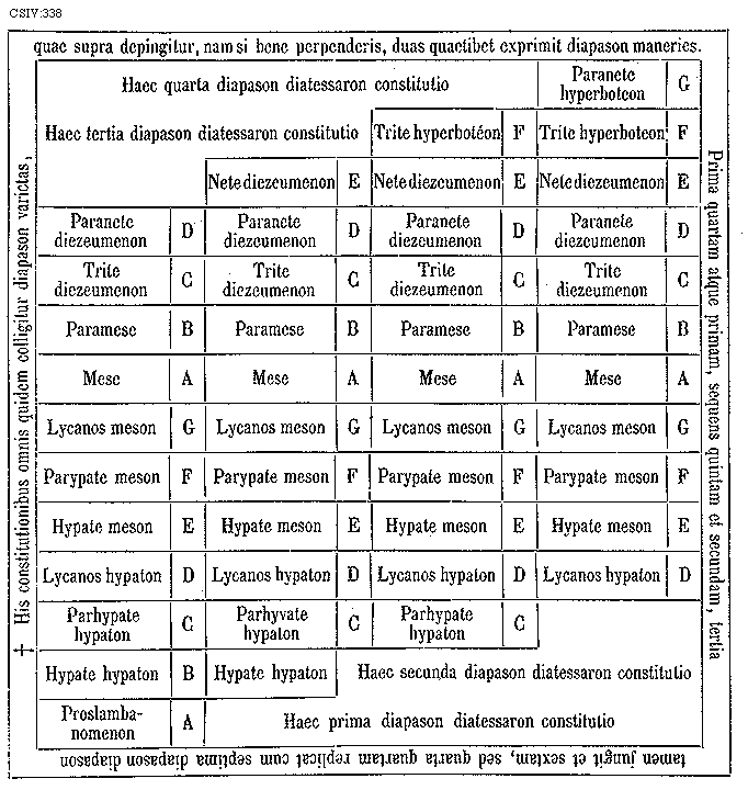 [CSIV:338; text: * His constitutionibus omnis quidem colligitur diapason varictas, quae supra depingitur, nam si bene perpenderis, duas quaetibet exprimit diapason maneries. Prima quartam atque primam, sequens quintam et secundam, tertia tamen jungit et sextam, sed quarta quartam replicat cum septima diapason diapason. A B C D E F G, Haec quarta diapason diatessaron constitutio, Haec tertia diapason diatessaron constitutio, Paranete hyperboteon, Trite hyperboteon, Nete diezeumenon, Paranete diezeumenon, Trite diezeumenon, Paramese, Mese, Lycanos meson, Parypate meson, Hypate meson, Lycanos hypaton, Parhypate hypaton, Hypate hypaton, Haec secunda diapason diatessaron constitutio, Proslambanomenon, Haec prima diapason diatessaron constitutio] [GALRIT3 05GF]