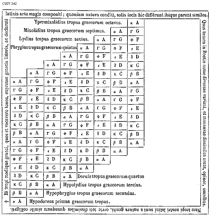 [CSIV:342; text: * Hi tropi modique graeci, quos et vocavero tonos, expresse graecis litteris, ac declarati latinis arte magis compositi; quoniam natura conditi, solis locis hic differunt ibique parent similes. Quos tamen in Boetio notae diversae variant, et mensurae dissimiles erant, opinor, omnibus. Nam tropi nostri latini sunt a natura geniti, certe toti dissimiles quanquam simile colligati. Ypermixolidius tropus graecorum octavus. Mixolidius tropus graecorum septimus. Lydius tropus graecorum sextus. Phrygius tropus graecorum quintus, Doruis tropus graecorum quartus, Hypolydius tropus graecorum tercius. Hypophrygius tropus graecorum secundus. Hypodoreus primus graecorum tropus. [Alpha] A, [Beta] B, [Kappa] C, [Delta] D, [Epsilon] E, [Phi] F, [Gamma] G] [GALRIT3 07GF]