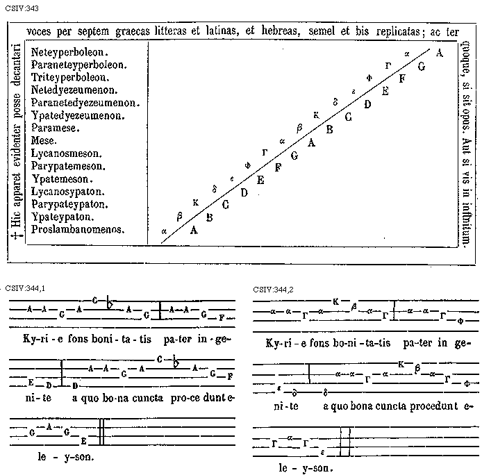 [CSIV:343; text: * Hic apparet evidenter posse decantari voces per septem graecas litteras et latinas, et hebreas, semel et bis replicatas; ac ter quoque, si sit opus. Aut si vis in infinitum. Neteyperboleon. Paraneteyperboleon. Triteyperboleon. Netedyezeumenon. Paranetedyezeumenon. Ypatedyezeumenon. Paramese. Mese. Lycanosmeson. Parypatemeson. Ypatemeson. Lycanosypaton. Parypateypaton. Ypateypaton. Proslambanomenos. A B C D E F G [Alpha] [Beta] [Kappa] [Delta] [Epsilon] [Phi] [Gamma]] [GALRIT3 08GF]