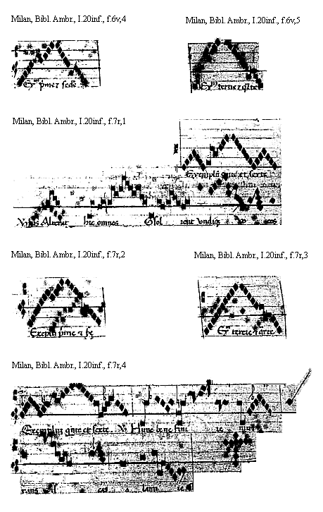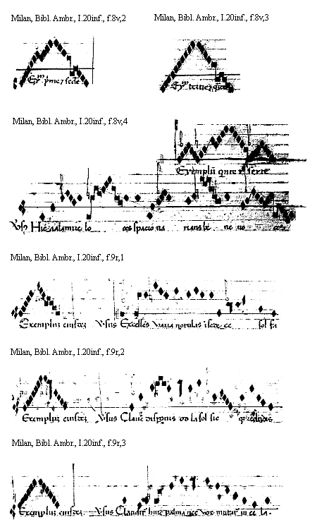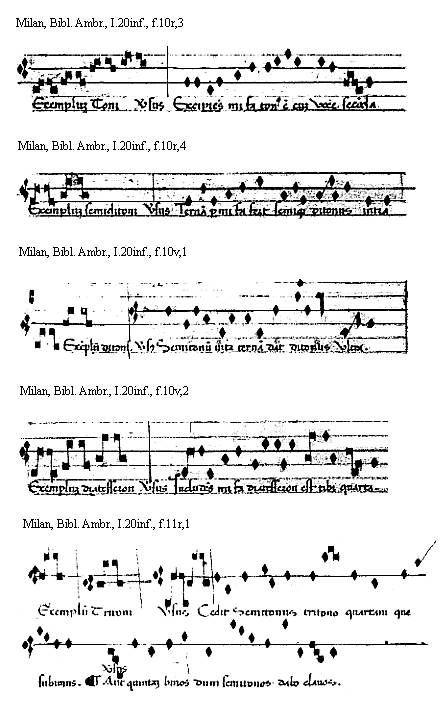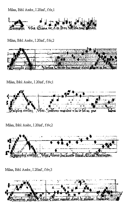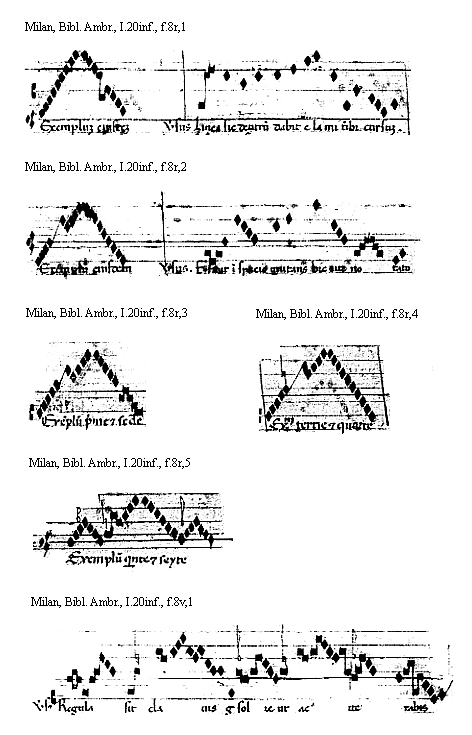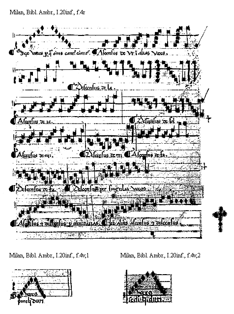 [Milan, Bibl. Ambr., I.20.inf., f.4r; text: Sex voces per quas omnis cantus canitur., Ascensus de vt in alias voces., Descensus de la., Ascensus de re., Descensus de sol., Ascensus de mi., Descensus de mi, Ascensus de fa., Descensus de fa., Descensus per singulas voces., Ascensus et descensus per concordantias., Item alius ascensus et descensus.] [JOHPALM 02GF]