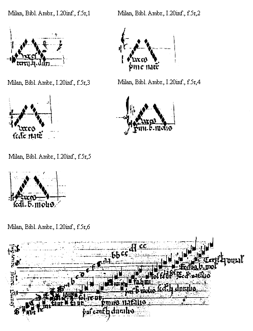 NOtis siue figuris simplicibus in cantu corali vtimur duabus quadrata videlicet ut sic [B,B,B]. Et quadrangula. id est. que quatuor habet angulos oppositos duos obtusos et duos acutos ita quod anguli acuti sese respiciunt sursum et deorsum et obtusi dextrorsum. et sinistrorsum Vt sic. [S,S,S,S] He tamen figure in prolatione non differunt sed pro libito alicui vtuntur priori aliqui altera et aliqui eas comiscent. Hec uero commixtio specialius fieri solet cum cantus coralis imitatur mensuratum quoniam tunc quadrata ponitur pro longa et illa qudrangulla pro breui sicut fit in aliquibus sequentiis et in symbolo. Quelibet autem dictarum figurarum situari debet precise supra sillabam si sillaba unam tamen recipit.