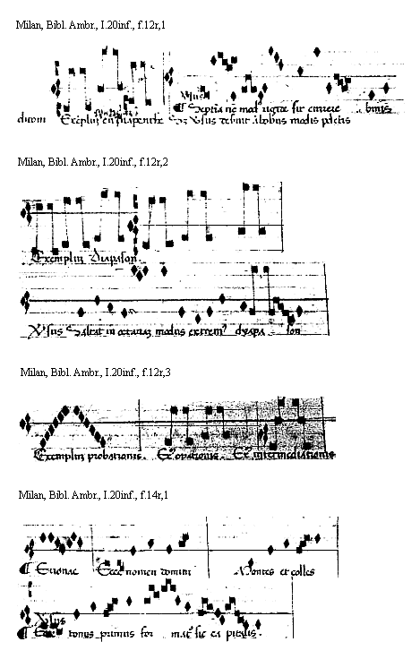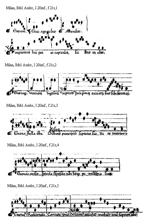 SEptimi toni in cantibus Ambrosianis ista sunt exempla varietatesque eius [f.22r] ponuntur plures. quare tamen propter congruentiam vna sepius ponitur pro altera.