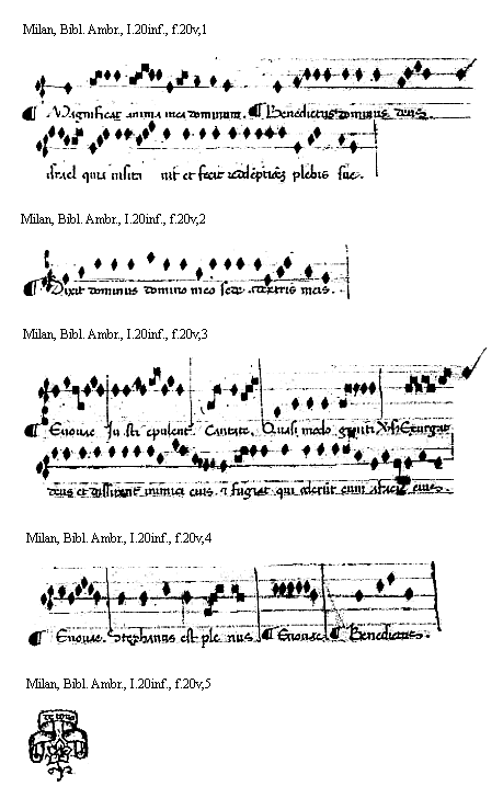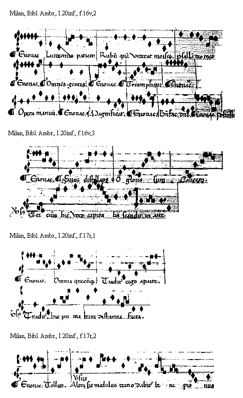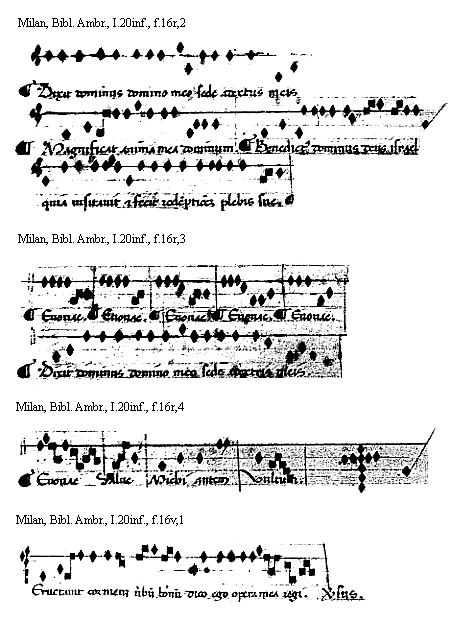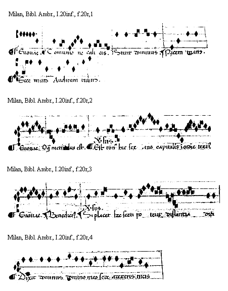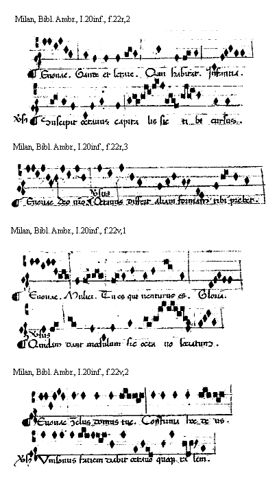 [Milan, Bibl. Ambr., I.20.inf., f.22v,1; text: Euouae. Mulier. Tu es qui uenturus es. Gloria. versus Quidam dant modulum sic octauo sociatum.] [JOHPALM 27GF]