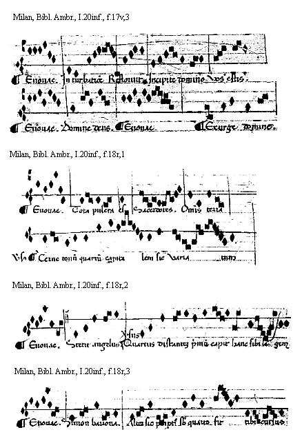 [Milan, Bibl. Ambr., I.20.inf., f.22r,2; text: Euouae. Gaude et letare. Qui habitat. Infantia. versus Suscipit octauus capitalis sic tibi cursus.] [JOHPALM 27GF]