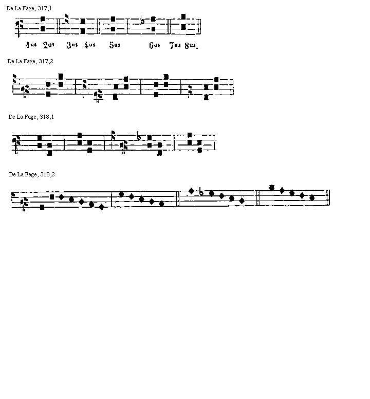 Item sciendum est quod unusquisque dictorum tonorum habet unam diatessaron quae formatur super suam diapente. Et haec est diatessaron primi toni: la-re. Tertius tonus habet istam diatessaron, quae est mi-la et formatur super suam diapente, quae est mi-mi. Quintus tonus habet istam diatessaron, quae formatur super suam diapente scilicet fa-fa vel ut-fa diatessaron. Septimus tonus habet istam diatessaron, quae formatur super suam diapente, scilicet: sol-sol, ut hic apparet per exemplum: