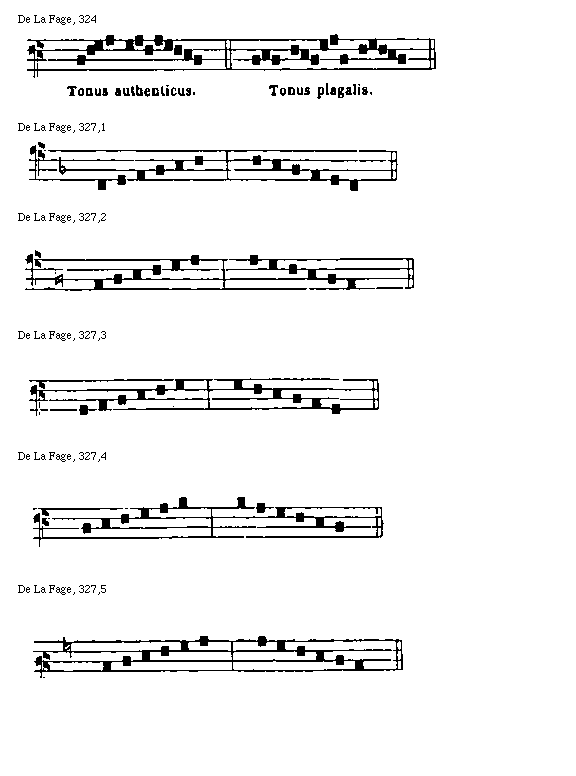 Exempla quae sequuntur sunt exempla tonorum psalmorum introitus ad missam. Itaque in quocumque psalmo introitus intonatur Gloria patri inferius, annotati tam psalmi quam Gloria patri sunt ejusdem toni. Et haec est regula ad cognoscendos ipsos tonos in introitibus; verbi gratia: primus ad tertiam, scilicet: fa sol la, secundus una inferius, scilicet: ut re fa, tertius ad tertiam ut re fa in C grave; [335] quartus ad quartam, scilicet: mi la, quintus est aequalis, scilicet: ut mi sol per b molle [fa la ut], sextus est aequalis, scilicet: fa sol la sicut primus. Septimus est aequalis, scilicet: ut fa mi fa sol [sol ut si ut re], et octavus est aequalis, scilicet: ut re ut fa [sol la sol ut], ut hic inferius patet: