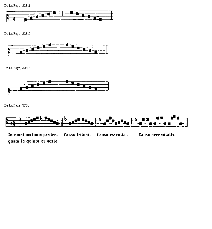 [De La Fage, 328,4; text: In omnibus tonis praeterquam in quinto et sexto. Causa tritoni. Causa essentiae. Causa necessitatis.] [NICCOM 06GF]