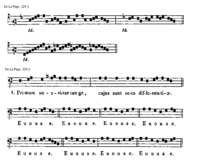 [De La Fage, 329,2; text: 1. Primum suaviter tange, cujus sunt octo differentiae. Euouae.] [NICCOM 07GF]