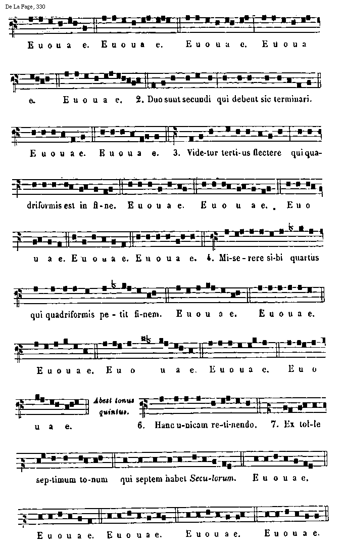 [330] [De La Fage, 330; text: 2. Duo sunt secundi qui debent sic terminari. 3. Videtur tertius flectere qui quadriformis est in fine. 4. Miserere sibi quartus qui quadriformis petit finem. Euouae. Abest tonus quintus. 6. Hanc unicam retinendo. 7. Ex tolle septimum tonum qui septem habet Seculorum.] [NICCOM 08GF]