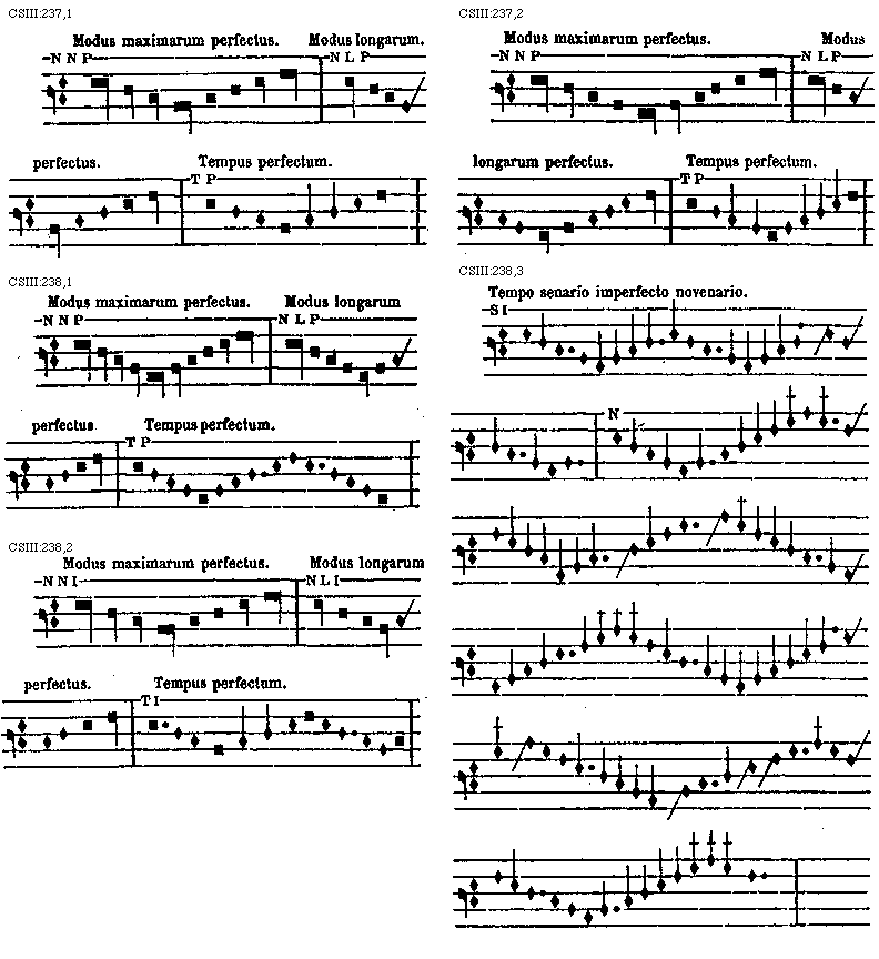 [CSIII:238,2; text: Modus maximarum perfectus,NLI; Modus longarum perfectus,NLI; Tempus perfectum,TI] [PROTRAP2 01GF]