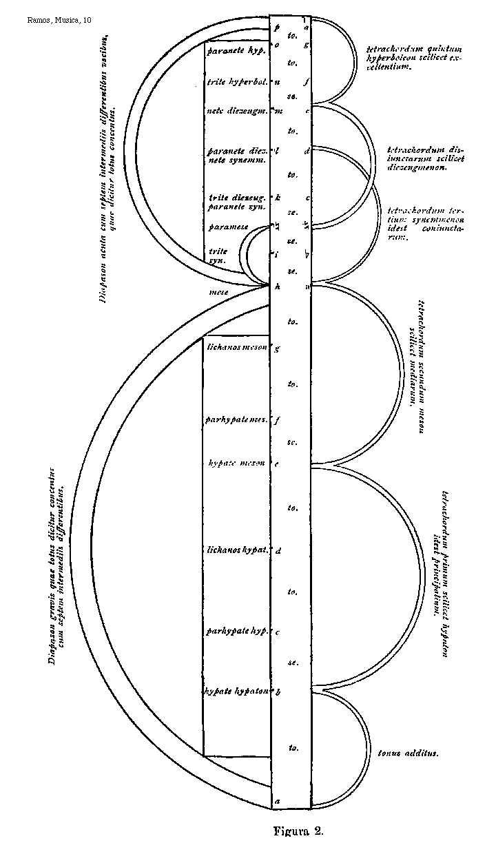 [10] [Ramos, Musica, 10; text: Figura 2. Diapason gravis quae totus dicitur concentus cum septem intermediis differentibus. hypate hypaton, parhypate hypaton, lichanos hypaton, hypate meson, parhypate meson, lichanos meson, mese, Diapason acuta cum septem intermediis differentibus vocibus, quae dicitur totus concentus. trite synemmenon, paramese, trite diezeugmenon, paranete synemmenon, paranete diezeugmenon, nete synemmenon, nete diezeugmenon, trite hyperboleon, paranete hyperboleon, tonus additus. tetrachordum primum scilicet hypaton idest principalium. tetrachordum secundum meson scilicet mediarum. tetrachordum tertium synemmenon idest coniunctarum. tetrachordum disiunctarum scilicet diezeugmenon. tetrachordum quintum hyperboleon scilicet excellentium. tonus, semitonium, a, b, c, d, e, f, g, h, i, k, l, m, n, o, p, [rob], [sqb]] [RAMMP 02GF]