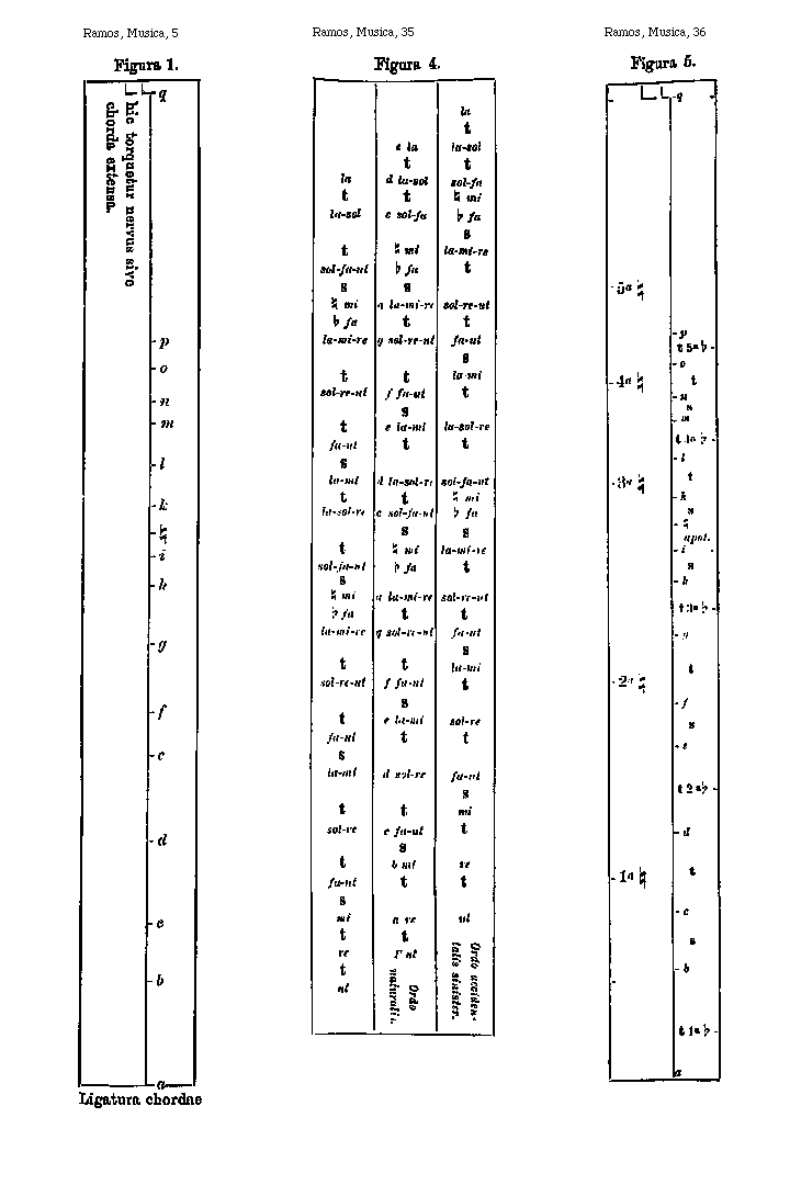 [Ramos, Musica, 36; text: Figura 5. prima [sqb], secunda [sqb], tertia [sqb], quarta [sqb], quinta [sqb], prima [rob], secunda [rob], tertia [rob], quarta [rob], quinta [rob], a, b, c, d, e, f, g, h, i, [sqb], k, l, m, n, o, p, q, tonus, semitonium, apotome] [RAMMP 01GF]
