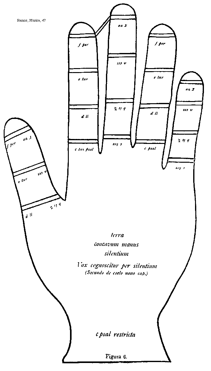 Nunc autem artem memorativam, hoc est per digitorum iuncturas litteras canendas cum vocibus hoc modo in palma collocamus. Non sine ratione ut Guido ad libitum sed cum maxima rei similitudine voces disponemus hoc modo: Sit concavum instrumenti in concavo manus, ubi silentium ponatur, quoniam ibi nulla vox fieri debet, eritque sicut terra. Deinde prima vox in restricta ponetur, sub qua gravior non sit ponenda, quia silentium erit; nam concavum manus (pagina 35) carens iunctura motu caret distincto. Sed restricta motum habet primum ex applicatione montis pollicis ad pinguedinem manus. Inde igitur, quia motus ibi est, sonum locabimus; deinde secunda vox in radice pollicis in parte exteriori, ubi alius motus [46] ab isto distinctus est; tertiam vero in alia iunctura pollicis exteriori, ubi motus etiam est distinctus; quartam vero in paenultima exteriori eadem ratione. Quintam vero, quoniam maiorem convenientiam habet cum prima quam ipsa quarta, in vertice pollicis ponemus conversam, idest respicientem primam. Hoc ideo, quia illa vox et aliae tres sequentes eiusdem qualitatis sunt cum praemissis quatuor, scilicet diatessaron. Et sic sextam vocem ponemus in sequenti iunctura interiori respicientem inferius et sic etiam septimam. Et sic septem differentes differenti modo ponentur. Sed octava, quae similis est primae, acutior tamen in radice indicis locabitur, et quoniam digitus ille subtilior est pollice, clare monstratur chordam subtiliorem voces reddere subtiliores. Aliam vero diapason hoc modo disponemus, ut similiter cum octava huius primae diapason scilicet tas ponamus primam sequentis scilicet psal in ipsius indicis radice et in secunda iunctura li, in tertia tur, at in summo per, a qua summitate usque ad digiti medii summitatem duas lineas protrahemus taliter, quod videantur illi duo digiti alligati superius, et in summitate medii digiti ponemus vo conversam eadem ratione, qua de alia diximus. Sic et voces sequentes sequentibus iuncturis aptabimus, ita ut in radice ipsius medii digiti vox octava collocetur et in radice medici psal in unisono ponatur. Et idem fiat de alia diapason tertia cum auriculari, in cuius radice tas faciet finem, non quia ultra procedere ad acutiores non posse dicamus nec sub gravioribus alias posse remitti negemus; sed hoc dicimus, quia his tribus diapason satis est dilatata doctrina. Et in gravibus chordis vocis est modus, ut non ad taciturnitatem usque gravitas descendat, et in acutis ille custoditur acuminis modus, ne nervi, ut dicit Boetius, nimium tensi vocis tenuitate rumpantur, sed totum sibi sit consentaneum atque conveniens. Totum hoc igitur subiecta patefaciet figura.