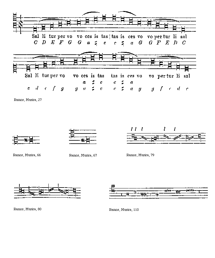 Alii vero sacrae scripturae appropriant modum procedendi ut: Descendant in profundum quasi lapis. Profundum in musica est cuiuslibet vocis sua octava inferius. Sed e contra cum dicit: Suspendimus organa nostra. Nos etiam sacrae scripturae canones attribuendo [92] quam plurimos posuimus, ut in Requiem aeternam canon: Ut requiescant a laboribus suis insinuamus, quod ut et re sileant, ceterae vero cantent. Sed etsi quiescant numero, tamen computamus valorem notarum in pausis. Sed cum secundo dicitur: Si tenes cum domino Agamemnon, de capite nullos amittes capillos in paranete neteque synemmenon; illorum scilicet opera secuntur illos omnes, illas notulas in canone priori dimissas esse resumendas intimatur. Itaque nota, quae fuit dimissa in ut, notulam in ut positam sequatur, et quae in re quievit, post notulam re laborando reclamet, ut verba consonent rebus. Et cum ex superioribus habeamus paraneten synemmenon esse k in coniuncto, neten vero l in eodem, sequitur, quod opera illorum sequuntur illos in diapente reclamando. Et sic, cum notulae in secunda parte sic disponantur f g h, debet facta operum additione f k g l l h cantari, ita quod valor praecedentium notularum integre resumatur. Sic et in alio, ubi diximus: Ut quiescat, donec optata veniat, volumus ostendere: notula, quae fuerit in f scilicet, quae dicitur ut per vulgarium dictiones, quiescat idest sileat numerando, donec ad finem fuerit perventum (?). Sed cum in parte sequenti diximus: Et sicut mercenarii dies eius, ut supra volumus ostendere, id, quod inconcinnum remansit in prima, in paraneten synemmenon resumatur in secunda, ut in alio fecimus canone Ad modum mercenarii, cuius dies in fallo ad satisfactionem in aliis computantur.