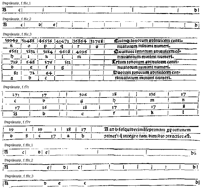 [Stapulensis, f.h3v,2; text: Proslambanomenos, Hypate hypaton, Parhypate hypaton, Lichanos hypaton, Hypate meson, Parhypate meson, Lichanos meson, Mese, Paramese diezeugmenon, Trite diezeugmenon, Paranete diezeugmenon, Nete dizeugmenon, Trite hyperboleon, Paranete hyperboleon, Nete hyperboleon, A, b, c, d, e f, g, h, k, l, m, n, o, p, q, 13824, 12288, 11664, 10368, 9216, 8748, 7776, 6912, 6144, 5832, 5184, 4608, 4374, 3888, 3456, Tonus, Semitonium minus, 11976, 8982, 5988, 4491, diesis, ditonus] [STAPMUS 12GF]