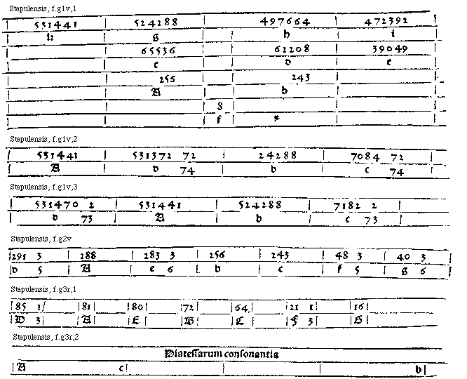 [Stapulensis, f.h3r; text: Proslambanomenos, Hypate hypaton, Parhypate hypaton, Lichanos hypaton, Hypate meson, Parhypate meson, Lichanos meson, Mese, Paramese diezeugmenon, Trite diezeugmenon, Paranete diezeugmenon, Nete diezeugmenon, Trite hyperboleon, Paranete hyperboleon, Nete hyperboleon, A, b, c, d, e, f, g, h, k, l, m, n, o, p, q, 2592, 5971968, 256, 2304, 5308416, 243, 2187, 5038848, 2048, 4718592, 1728, 3981312, 3779136, 3538944, 1296, 2985984, 1152, 2654208, 2519424, 2359296, 964, 2221056, 2108268, 1974272, 648, 1492992, Tonus, Semitonium minus, Semitonium maius, Trisemitonium] [STAPMUS 12GF]