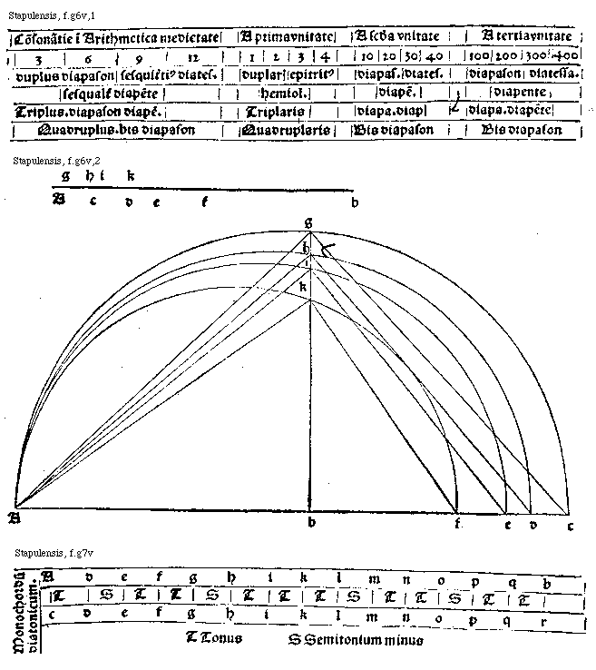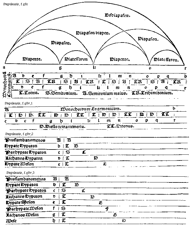 [Stapulensis, f.g8r; text: Bisdiapason, Diapason, Diapason diapente, Diapente, Diatessaron, Monochordum Chromaticum. A, b, c, d, e, f, g, h, i, k, l, m, n, o, p, q, r, T, S, TR, Tonus. Semitonium maius. Trihemitonium.] [STAPMUS 08GF]