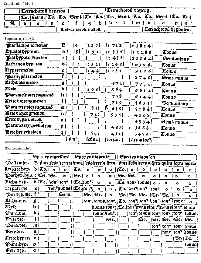 [Stapulensis, f.h1v,2; text: Proslambanomenos, Hypate hypaton, Parhypate hypaton, Lichanos hypaton, Hypate meson, Parhypate meson, Lichanos meson, Mese, Paramese diezeugmenon, Trite diezeugmenon, Paranete diezeugmenon, Nete diezeugmenon, Trite hyperboleon, Paranete hyperboleon, Nete hyperboleon, A, b, c, d, e, f, g, h, k, l, m, n, o, p, q, 9, 8, 216, 1728, 13824, 192, 1536, 12288, 1458, 11664, 162, 1296, 10368, 144, 1152, 9216, 8748, 972, 7776, 108, 864, 6912, 768, 6144, 729, 5832, 81, 648, 5184, 72, 576, 4608, 4374, 485, 3888, 54, 432, 3456, Tonus, Semitonium minus, primus, secundus, tertius, quartus locus] [STAPMUS 10GF]