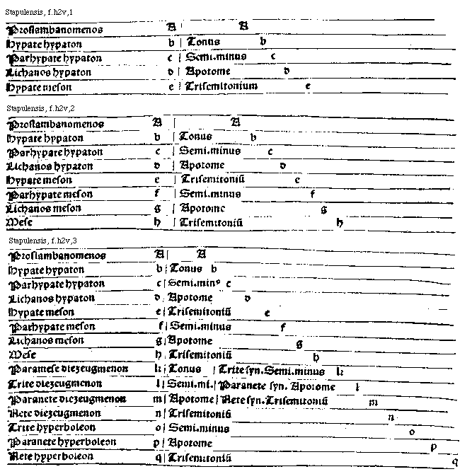 [Stapulensis, f.h2v,3; text: Proslambanomenos, Hypate hypaton, Parhypate hypaton, Lichanos hypaton, Hypate meson, Parhypate meson, Lichanos meson, Mese, Paramese diezeugmenon, Trite diezeugmenon, Paranete diezeugmenon, Nete diezeugmenon, Trite hyperboleon, Paranete hyperboleon, Nete hyperboleon, A, b, c, d, e, f, g, h, k, l, m, n, o, p, q, Tonus, Semitonium minus, Apotome, Trisemitonium, Trite synezeugmenon, Paranete synezeugmenon, Nete synezeugmenon] [STAPMUS 11GF]