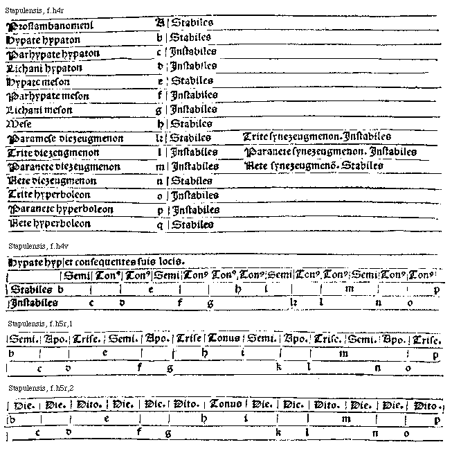 [Stapulensis, f.h4r; text: Proslambanomeni, Hypate hypaton, Parhypate hypaton, Lichani hypaton, Hypate meson, Parhypate meson, Lichani meson, Mese, Paramese diezeugmenon, Trite diezeugmenon, Paranete diezeugmenon, Nete diezeugmenon, Trite hyperboleon, Paranete hyperboleon, Nete hyperboleon, A, b, c, d, e, f, g, h, k, l, m, n, o, p, q, Stabiles, Instabiles, Trite synezeugmenon. Paranete synezeugmenon. Nete synezeugmenon.] [STAPMUS 13GF]