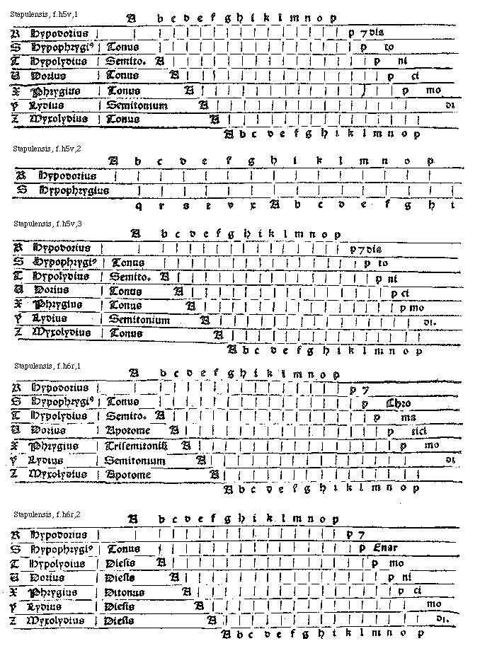 [Stapulensis, f.h6r,2; text: R, S, T, U, X, Y, Z, Hypodorius, Hypophrygius, Hypolydius, Dorius, Phrygius, Lydius, Myxolydius, Tonus, Diesis, Ditonus, A, b, c, d, e, f, g, h, i, k, l, m, n, o, p, septem Enarmonici modi.] [STAPMUS 14GF]