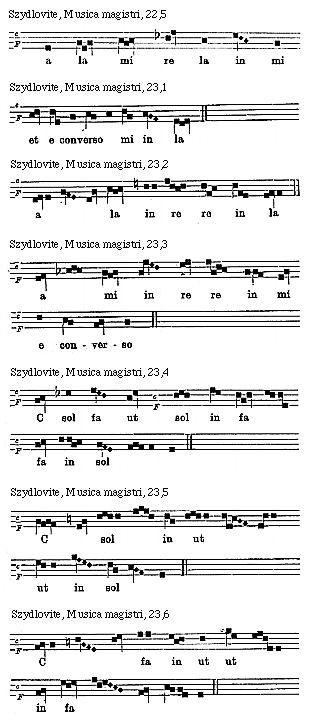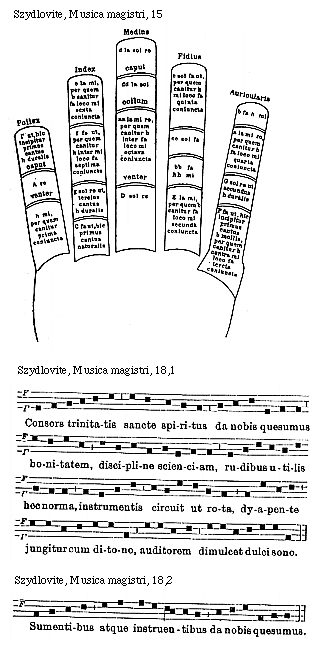 [Szydlovite, Musica magistri, 15; text: Pollex, Index, Medius, Fidius, Auricularis, [Gamma] ut, hic incipitur primus cantus h duralis caput, A re venter, h mi, per quem canitur prima coniuncta, e la mi, per quem b canitur fa loco mi sexta coniuncta, f fa ut, per quem canitur h inter mi loco fa septima coniuncta, g sol re ut, tercius cantus h duralis, C fa ut, hic primus cantus naturalis, d la sol re, caput, dd la sol, collum, aa la mi re, per quem canitur b inter fa loco mi octava coniuncta, venter, D sol re, c sol fa ut, per quem canitur h mi loco fa quinta coniuncta, cc sol fa, bb fa, hh mi, E la mi, per quem b canitur fa loco mi secunda coniuncta, b fa h mi, a la mi re, per quem canitur b fa loco mi quarta coniuncta, G sol re ut secundus h duralis, F fa ut, hic incipitur primus cantus b mollis, per quem canitur h contra mi loco fa tercia coniuncta] [SZYDMUS 01GF]