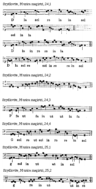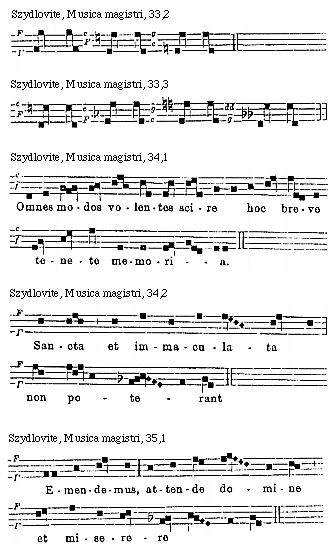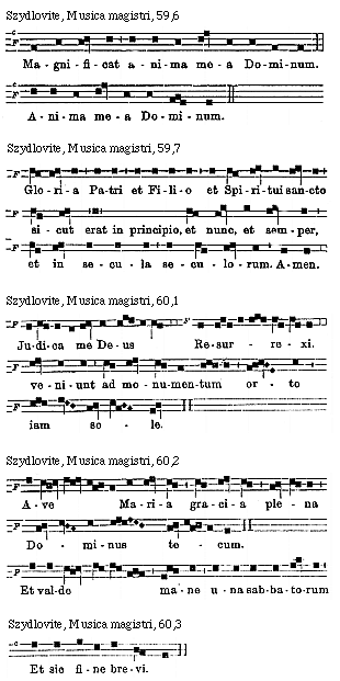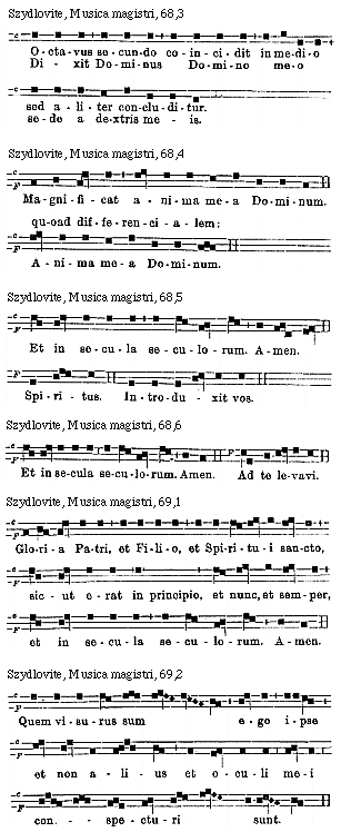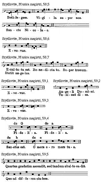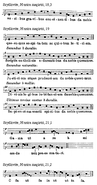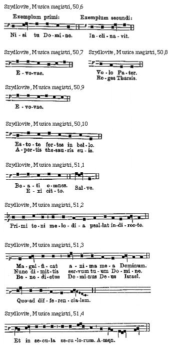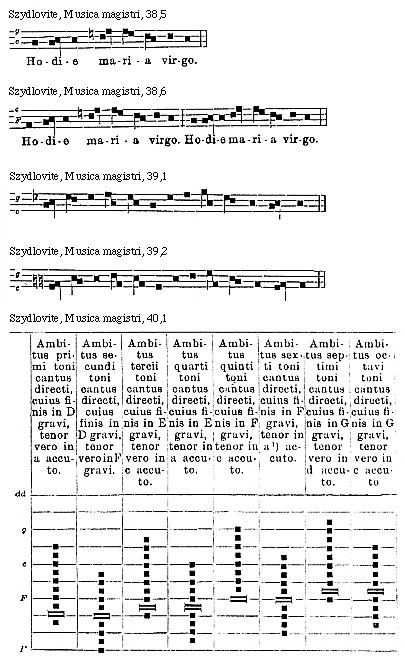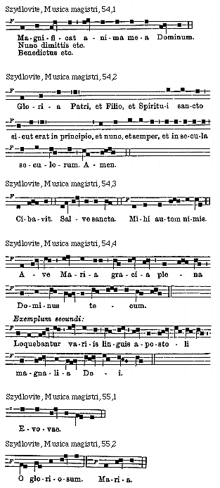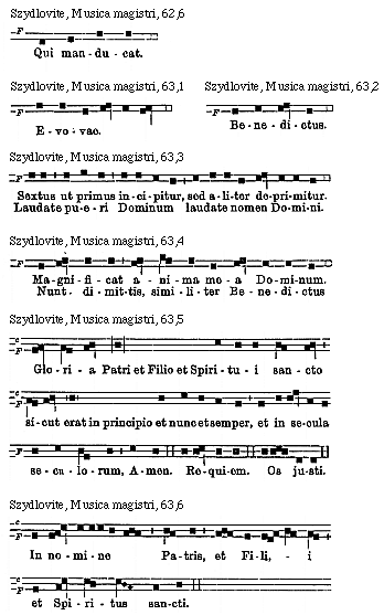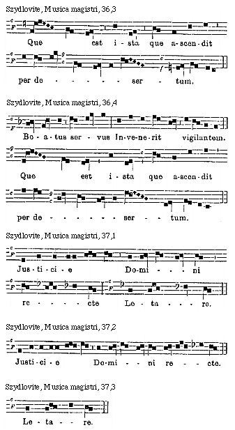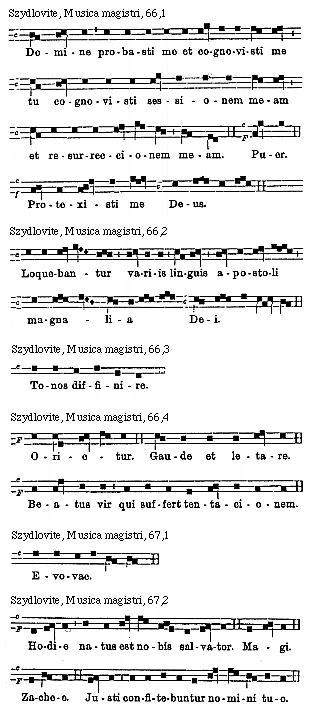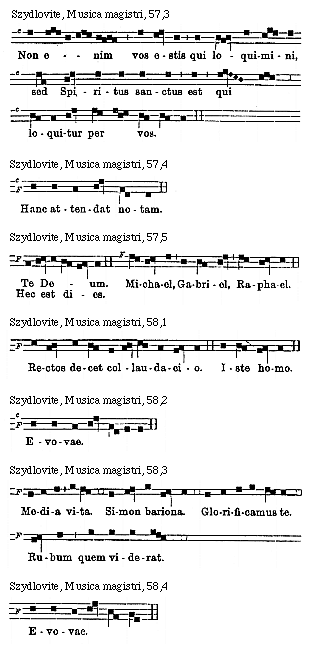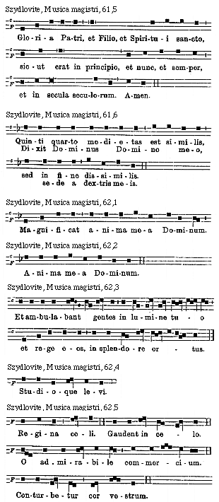 Source: Waclaw Gieburowski, Die "Musica Magistri Szydlovite": ein polnischer Choraltraktat des XV. Jahrh. und seine Stellung in der Choraltheorie des Mittelalters, mit Beruecksichtigung der Choraltheorie und -Praxis des XV. Jahrh. in Polen, sowie der Nachtridentinischen Choralreform (Posen: St. Adalbert, 1915), 9–72.