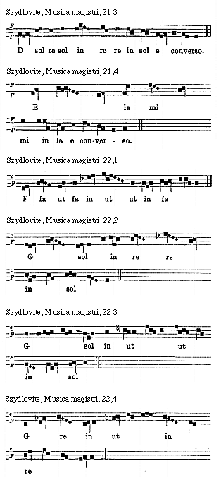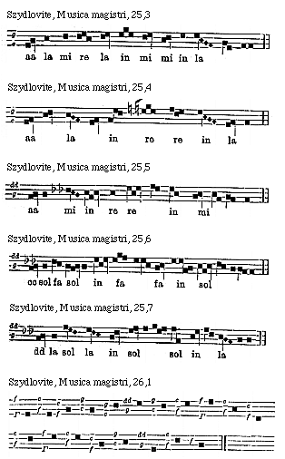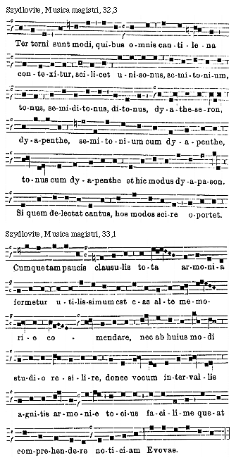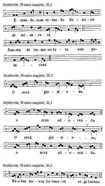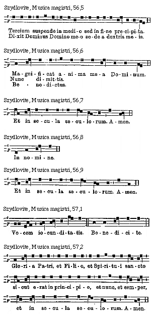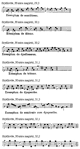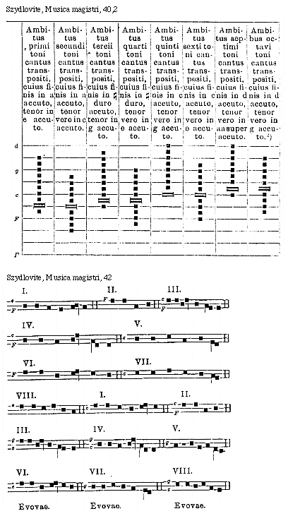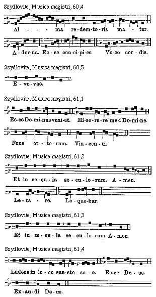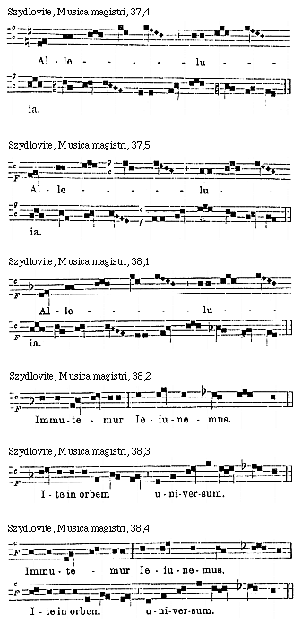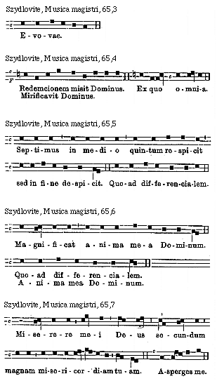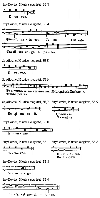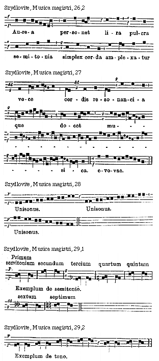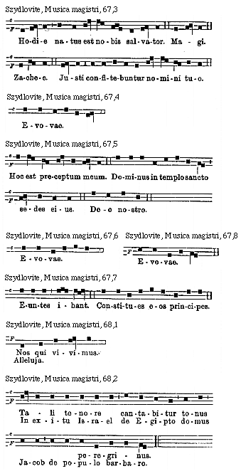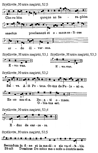 Source: Waclaw Gieburowski, Die "Musica Magistri Szydlovite": ein polnischer Choraltraktat des XV. Jahrh. und seine Stellung in der Choraltheorie des Mittelalters, mit Beruecksichtigung der Choraltheorie und -Praxis des XV. Jahrh. in Polen, sowie der Nachtridentinischen Choralreform (Posen: St. Adalbert, 1915), 9–72.